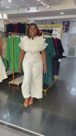 Tailored White Jumpsuit – Sleek & Ruffled Neck