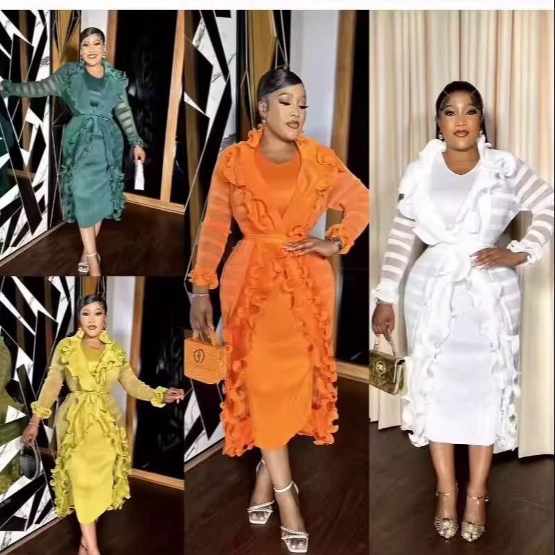 Turn heads in this elegant and bold ruffled mesh midi dress, dress & jacket - designed to make a statement. Featuring sheer mesh sleeves, dramatic front ruffle detailing, and a figure-flattering silhouette, this piece blends sophistication with modern flair.